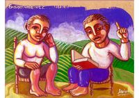El libro rojo ocupa un lugar central en esta pareja sentada en sillas de anea : aunque ambos aparecen girados hacia nosotros, no necesitan que los miremos. Con la mano derecha levantada y ademán autoritario, él pronuncia unas palabras que la arrastran, a ella, absorta en su escucha, hacia la ensoñación. Sus pies menudos casi se tocan. Bajo el cielo azul y blanco efervescente, las palabras suscitan el paisaje verde, ondulado, rayado que imita sus cabellos peinados para atrás. ¿Leen dentro o fuera, en la casa o en pleno campo? Sus ojos serios tienen la firmeza de los iconos.