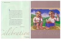 Sous le ciel bleu en effervescence blanche, les mots suscitent le paysage vert, vallonné, rayé, qui mime leurs chevelures peignées vers l'arrière. Lisent-ils dedans ou dehors, dans la maison ou en plein champ? Leurs yeux graves ont la fixité des icônes: Il y avait une fois.